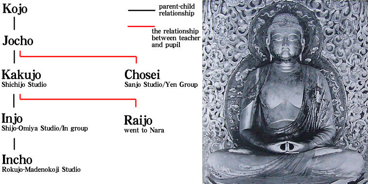 Further, Kakujo who is son of Jocho is key man. He had had his studio at Kyoto Shichijo (called Shichijo Studio), and he worked. His studio had survived than any other studios.